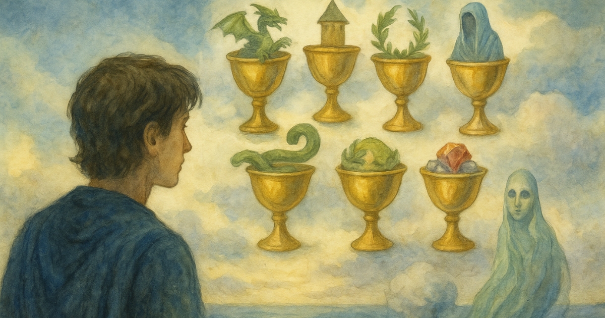 De Zeven van Bekers toont een figuur die met grote ogen kijkt naar zeven bekers die in de lucht zweven. Elke beker bevat iets anders: een draak, een juweel, een lauwerkrans, een masker, een toren, een slang en een sluier met een gezicht. Het zijn symbolen van verleiding, hoop, angst en illusie. Alles lijkt mogelijk… en juist daardoor wordt het verwarrend. De figuur op de kaart aarzelt. Wat is echt? Wat is een droom? Wat is een valkuil?